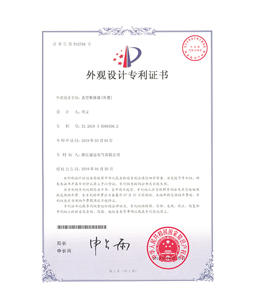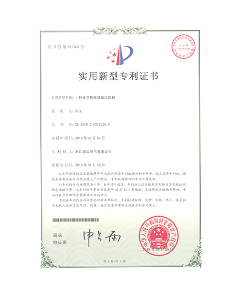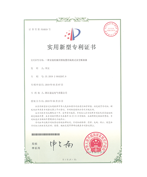 一种安装机械闭锁装置的隔离式真空断路器实用新型专利证书